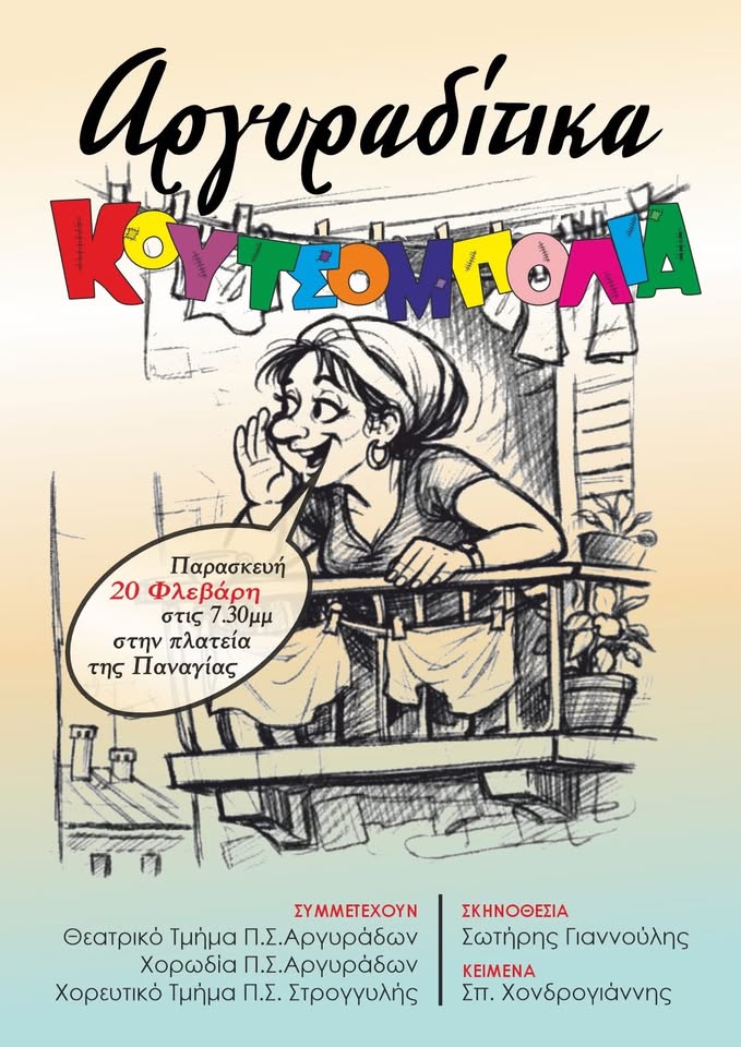 Την Παρασκευή 20/2 και ώρα 7.30 στην πλατεία Παναγίας στις Αργυράδες ετοιμαστείτε για τρελό γλέντι! Ο Πολιτιστικός Σύλλογος Αργυράδων διοργανώνει για μια ακόμα χρονιά τα «Αργυραδίτικα κουτσομπολιά». Με το θεατρικό τμήμα του Πολιτιστικού Συλλόγου Αργυράδων, τη χορωδία Αργυράδων και το χορευτικό του Π.Σ. Στρογγυλής. Με κείμενα του Σπύρου Χονδρογιάννη και σε σκηνοθεσία του Σωτήρη Γιαννούλη