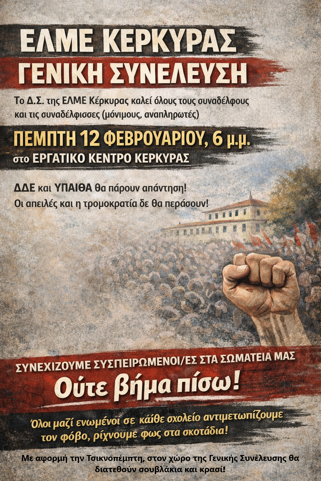 Το Δ. Σ. της ΕΛΜΕ Κέρκυρας καλεί όλους τους συναδέλφους και τις συναδέλφισσες (μόνιμους, αναπληρωτές) στη Γενική Συνέλευση την Πέμπτη, 12 Φεβρουαρίου, στις 6 μ.μ., στο Εργατικό Κέντρο Κέρκυρας με θέματα:
