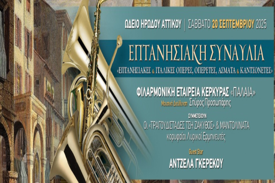 Την τιμητική τους έχουν τα Επτάνησα στο Ωδείο Ηρώδου Αττικού το Σάββατο 20 Σεπτεμβρίου, σε μια συναρπαστική μουσική παράσταση που ενώνει τις ρομαντικές καντάδες με τις λυρικές άριες, μια παράδοση που δικαιωματικά κατέχουν τα Επτάνησα. Το Αθηναϊκό κοινό θα έχει τη μοναδική ευκαιρία να ακούσει ζωντανά την «Παλαιά Φιλαρμονική Κερκύρας», ως είθισται να λέγεται η Φιλαρμονική Εταιρεία Κερκύρας, η οποία είναι ένας από τους ιστορικότερους μορφωτικούς και πολιτιστικούς φορείς της χώρας με συνεχή πορεία 185 ετών (ιδρύθηκε το 1840).