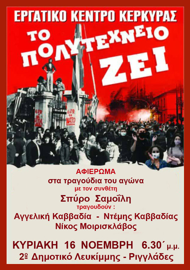 Το Εργατικό Κέντρο Κέρκυρας διοργανώνει μουσικό αφιέρωμα "Το Πολυτεχνείο Ζει" με τον συνθέτη Σπύρο Σαμοϊλη. Τραγουδούν: Αγγελική Καββαδία - Ντέμης Καββαδίας - Νίκος Μοιρισκλάβος. Την Κυριακή 16 Νοεμβρίου στις 6:30 μ.μ. στο 2ο Δημοτικό Λευκίμμης - Ριγγλάδες
