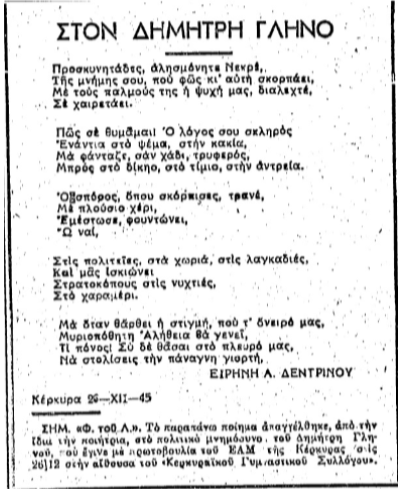 Εκεί παρουσιάστηκε και απαγγέλθηκε από την Κερκυραία λογοτέχνιδα Ειρήνη Δεντρινού ποίημά της, με τον τίτλο «Στον Δημήτρη Γληνό». Φωτεινή και τολμηρή μορφή του κερκυραϊκού δημοτικιστικού κινήματος και «ψυχή» της τοπικής ΕΑΜικής οργάνωσης Εθνική Αλληλεγγύη τα χρόνια της Κατοχής, η Δεντρινού (1879-1974), όπως μαρτυρεί το ποίημά της, είχε γνωρίσει τον Γληνό (1882-1943). Ακολουθεί το ποίημα, όπως εδημοσιεύτηκε: