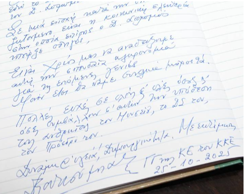 Ολοκληρώνοντας την επίσκεψή του στο σπίτι του Διονύσιου Σολωμού, ο Δ. Κουτσούμπας, αξιοποιώντας και τα ιστορικά λόγια του μεγάλου ποιητή Κώστα Βάρναλη (1884-1974) για το σολωμικό έργο, έγραψε στο Βιβλίο Επισκεπτών του Μουσείου: