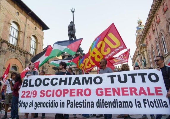 Παντού στη γειτονική χώρα τα συνδικάτα έχουν καλέσει σε απεργία. Στις κινητοποιήσεις πρωταγωνιστές στις μάχες που δόθηκαν σώμα με σώμα με τα γκλομπς της αστυνομίας, οι COBAS. Comitati di base (οι επιτροπές βάσης) πρωταγωνιστούν και στη Νάπολη. Σαράντα χιλιάδες στους δρόμους της πόλης των μεγάλων ταξικών αντιθέσεων στην απεργία της 22-9-2025. Οι διαδηλωτές μπήκαν στις αποβάθρες του σιδηροδρομικού σταθμού και στη συνέχεια κατευθύνθηκαν στο λιμάνι. Στο μπλοκάρισμα του σταθμού, του λιμανιού και του τελεφερίκ, στην πρώτη γραμμή, εκπαιδευτικοί (COBAS SCUOLA) και υγειονομικοί.