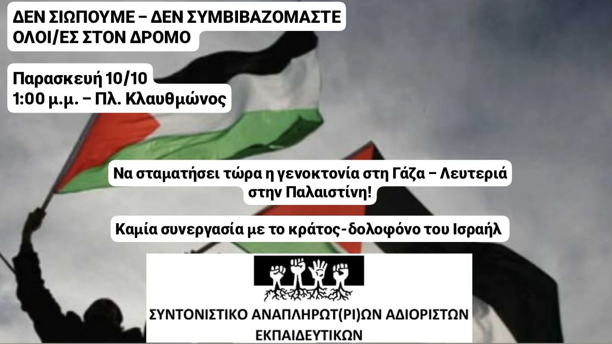 Αναπληρωτές: Δε σιωπούμε - Δε συμβιβαζόμαστε - Όλοι-ες στο δρόμο για την Παλαιστίνη!