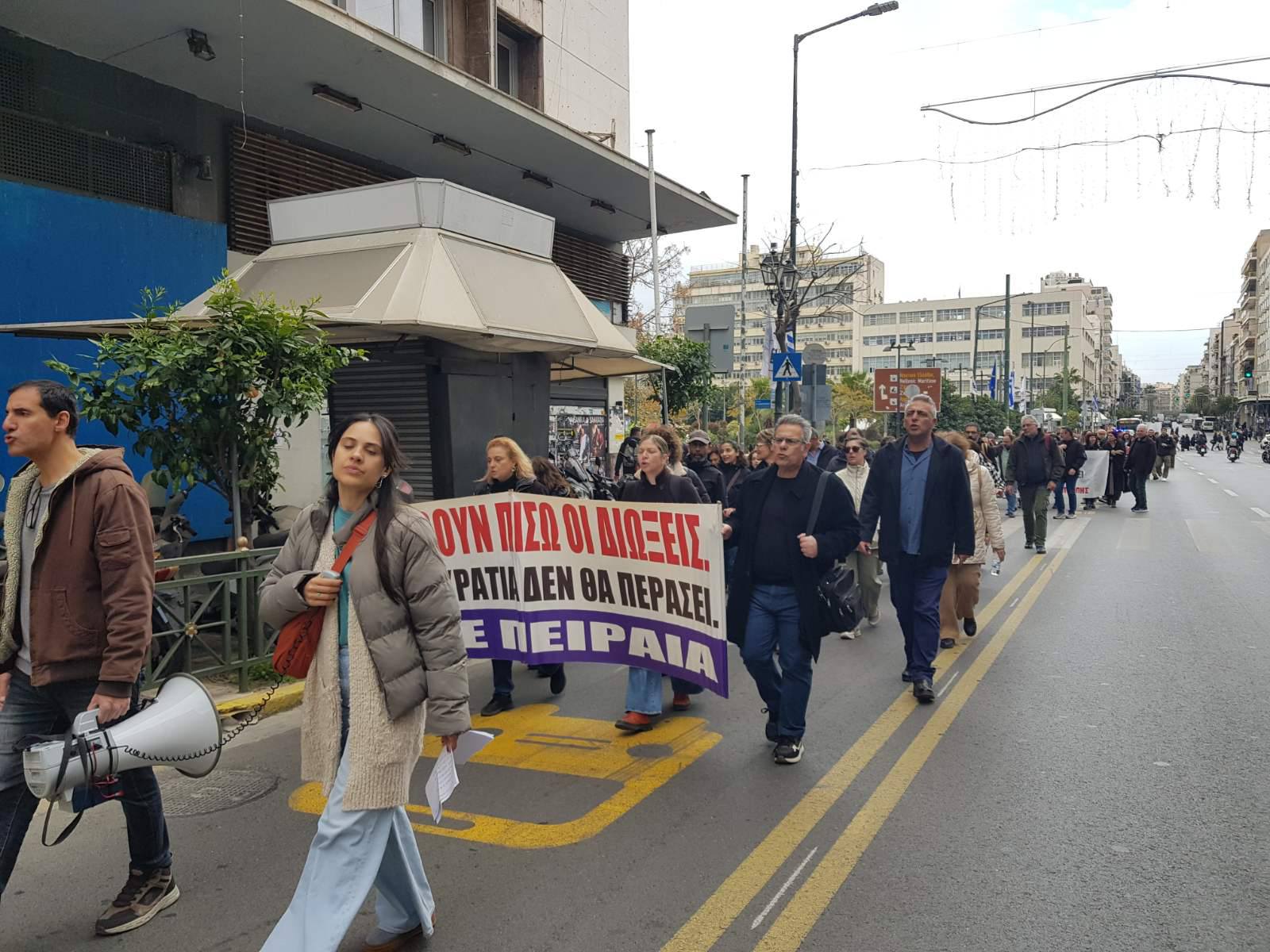 Μήνυμα ενάντια στον αυταρχισμό και τις διώξεις η σημερινή μαζική συγκέντρωση εκπαιδευτικών έξω από τα δικαστήρια του Πειραιά και η πορεία που ακολούθησε.