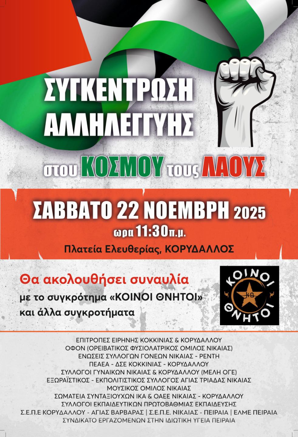 Σας καλούμε το Σάββατο 22 Νοέμβρη 2025, ώρα 11:30π.μ., στην Πλατεία Ελευθερίας στον Κορυδαλλό (σταθμός μετρό ‘’Κορυδαλλός’’) στην εκδήλωση αλληλεγγύης στον ηρωικά αγωνιζόμενο Παλαιστινιακό λαό και τους λαούς όλου του κόσμου. Θα ακολουθήσει συναυλία με νεανικά συγκροτήματα και καλλιτέχνες από τις γειτονιές μας καθώς και με το συγκρότημα "Κοινοί Θνητοί".