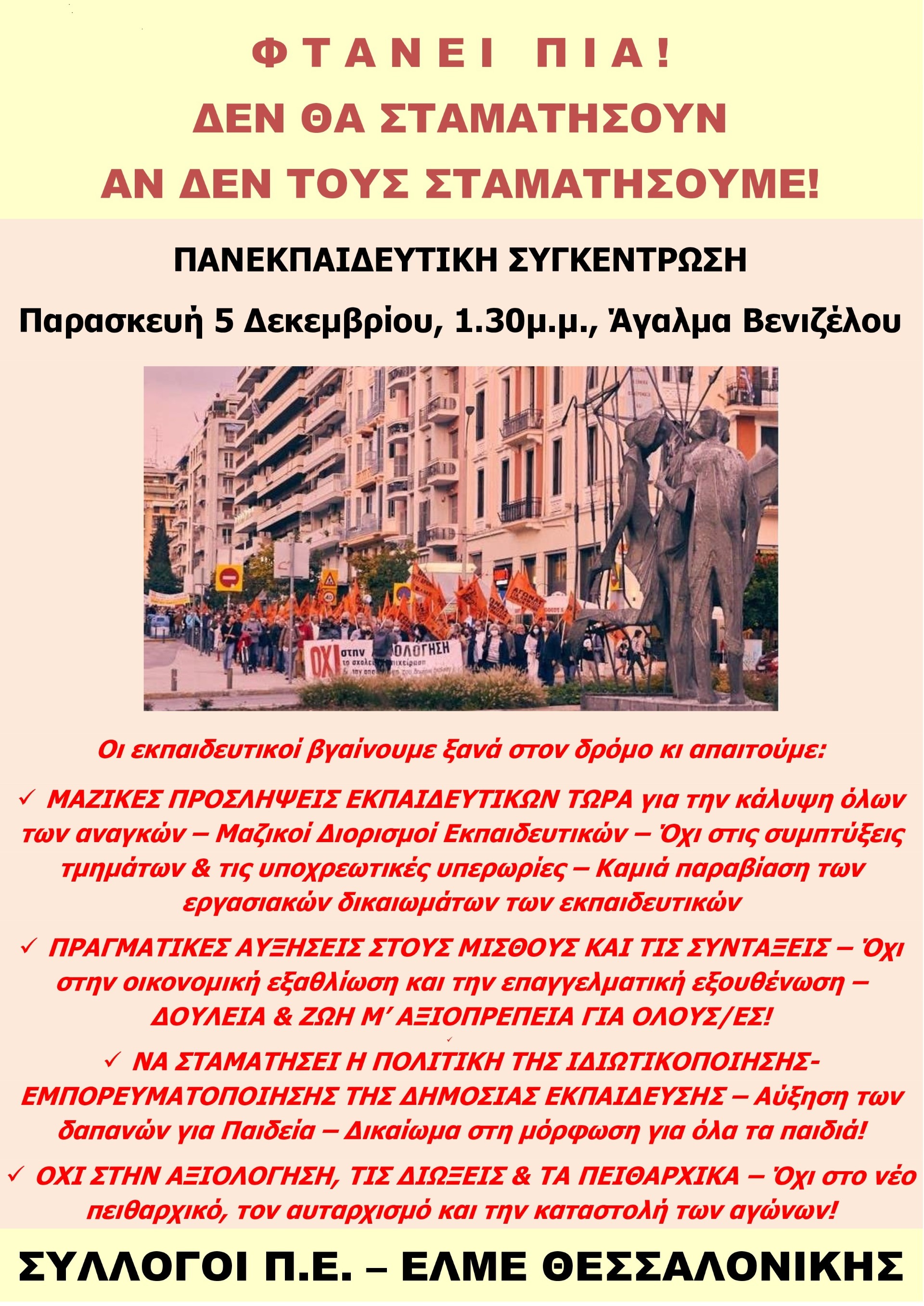 Εκπαιδευτικοί Θεσσαλονίκης: Πανεκπαιδευτική συγκέντρωση - Παρασκευή 5-12 - Άγαλμα Βενιζέλου