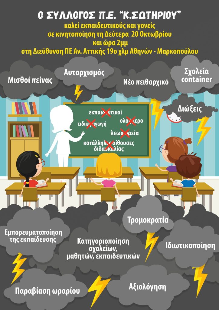 Ο σύλλογος Κ Σωτηρίου καλεί σε μαζική κινητοποίηση τη Δευτέρα 20/10 στις 2μμ στη Δ/νση ΠΕ Αν Αττικής.