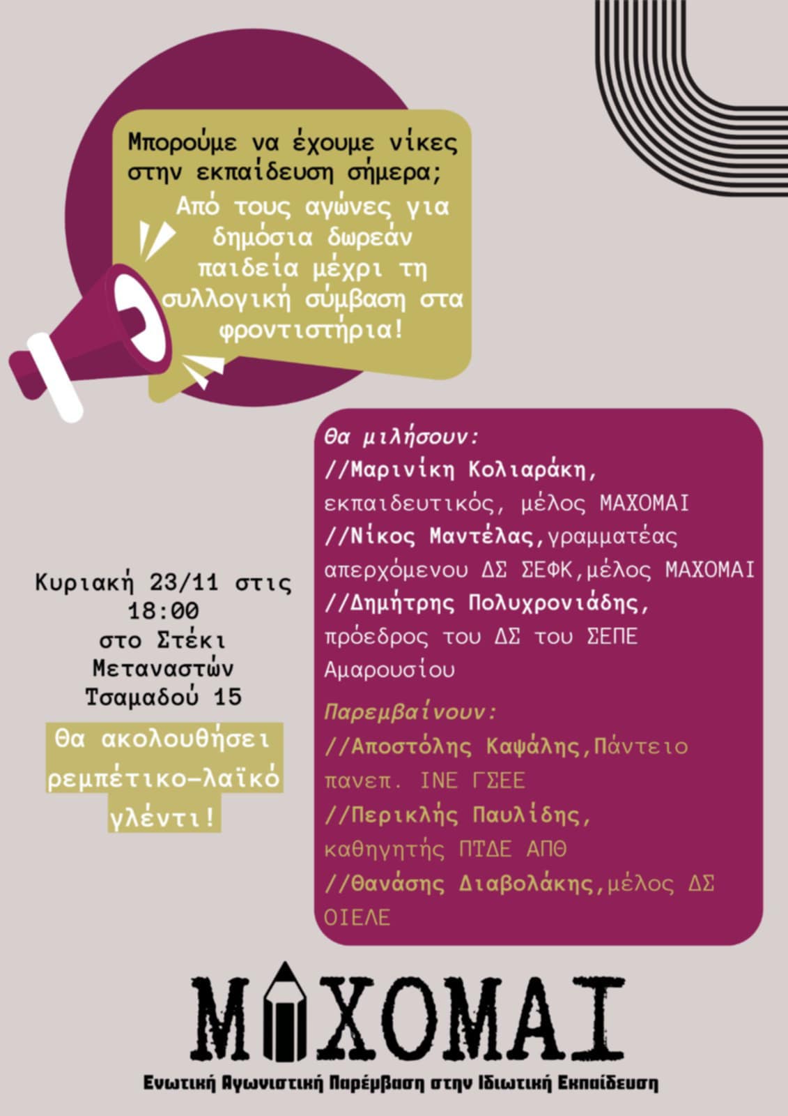 ΜΑΧΟΜΑΙ – Ενωτική Αγωνιστική Παρέμβαση στην Ιδιωτική Εκπαίδευση: Εκδήλωση Κυριακή 23/11