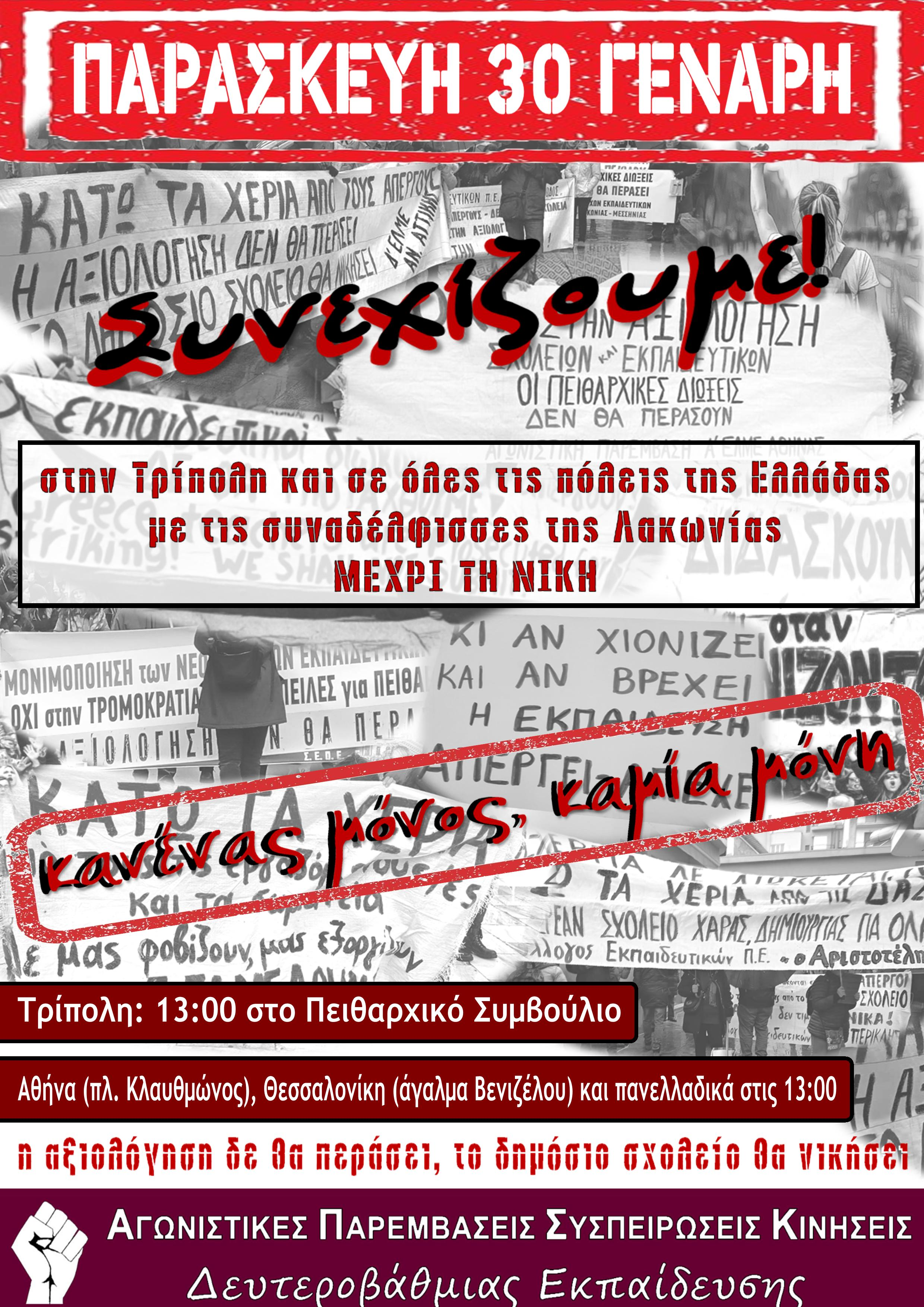 Μετά και την δεύτερη αναβολή της εκδίκασης των πειθαρχικών, την Τετάρτη 21/1 για Παρασκευή 30/1, οι Παρεμβάσεις ΔΕ και ΠΕ σε ΟΛΜΕ και ΔΟΕ αντίστοιχα, κατέθεσαν πρόταση στα ΔΣ ΟΛΜΕ και ΔΟΕ, να καλέσουν σε απεργιακές συγκεντρώσεις στην Τρίπολη και πανελλαδικά και να διαθέσουν λεωφορεία για την μεταφορά των συναδέλφων στην Τρίπολη, θεωρώντας ότι το αυτονόητο που έπρεπε να πράξουν άμεσα και χωρίς ολιγωρία οι ομοσπονδίες, θα ήταν, να κηρύξουν απεργία, την επόμενη ημέρα κιόλας, και να καλούν σε απεργιακές συγκεντρώσεις. (Το ΔΣ της ΔΟΕ έχει από το καταστατικό δικαίωμα να κηρύξει απεργία ενώ το ΔΣ της ΟΛΜΕ που έχει τον περιορισμό της κήρυξης απεργίας από ΓΣ προέδρων μπορούσε να κηρύξει 3ωρη στάση εργασίας και να καλέσει τις ΕΛΜΕ να βγάλουν συμπληρωματικές 3ωρες στάσεις εργασίας).