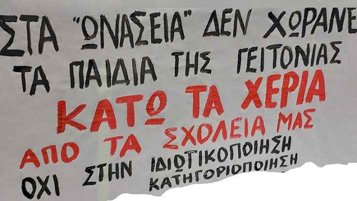 Η αντίθεσή μας στα Ωνάσεια Σχολεία δεν είναι ιδεολογική, αλλά βαθιά παιδαγωγική και κοινωνική. Τα σχολεία αυτά εισάγουν εξετάσεις και τεστ δεξιοτήτων για παιδιά 11–12 ετών, δημιουργώντας σχολεία δύο ταχυτήτων, εντείνοντας την πίεση, το άγχος και τη φροντιστηριοποίηση από το Δημοτικό. Αποκλείουν μαθητές με μαθησιακές δυσκολίες, αφού δεν προβλέπονται προφορικές εξετάσεις ούτε υποστηρικτικές δομές. Αποδυναμώνουν όλα τα υπόλοιπα σχολεία της πόλης, καθώς μόνο το 40–60% των μαθητών θα προέρχεται από την Καλλιθέα, «σπρώχνοντας» εκατοντάδες παιδιά στα ήδη υπερφορτωμένα γειτονικά σχολεία και δημιουργώντας υπερμεγέθη τμήματα.