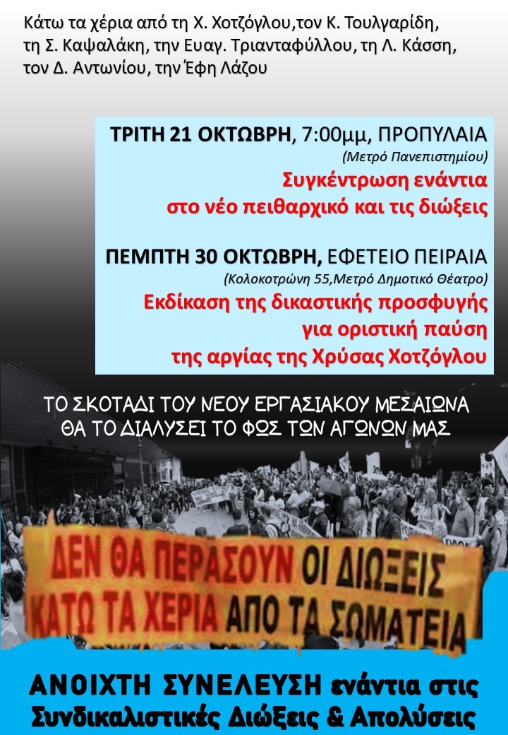 ΠΕΜΠΤΗ 30/10 ΚΑΛΟΥΜΕ ΣΕ ΣΥΓΚΕΝΤΡΩΣΗ ΣΤΟ ΔΙΟΙΚΗΤΙΚΟ ΕΦΕΤΕΙΟ ΠΕΙΡΑΙΑ ΟΠΟΥ ΕΧΕΙ ΓΙΝΕΙ Η ΔΙΚΑΣΤΙΚΗ ΠΡΟΣΦΥΓΗ ΕΝΑΝΤΙΑ ΣΤΗΝ ΑΡΓΙΑ ΤΗΣ ΧΡΥΣΑΣ ΧΟΤΖΟΓΛΟΥ