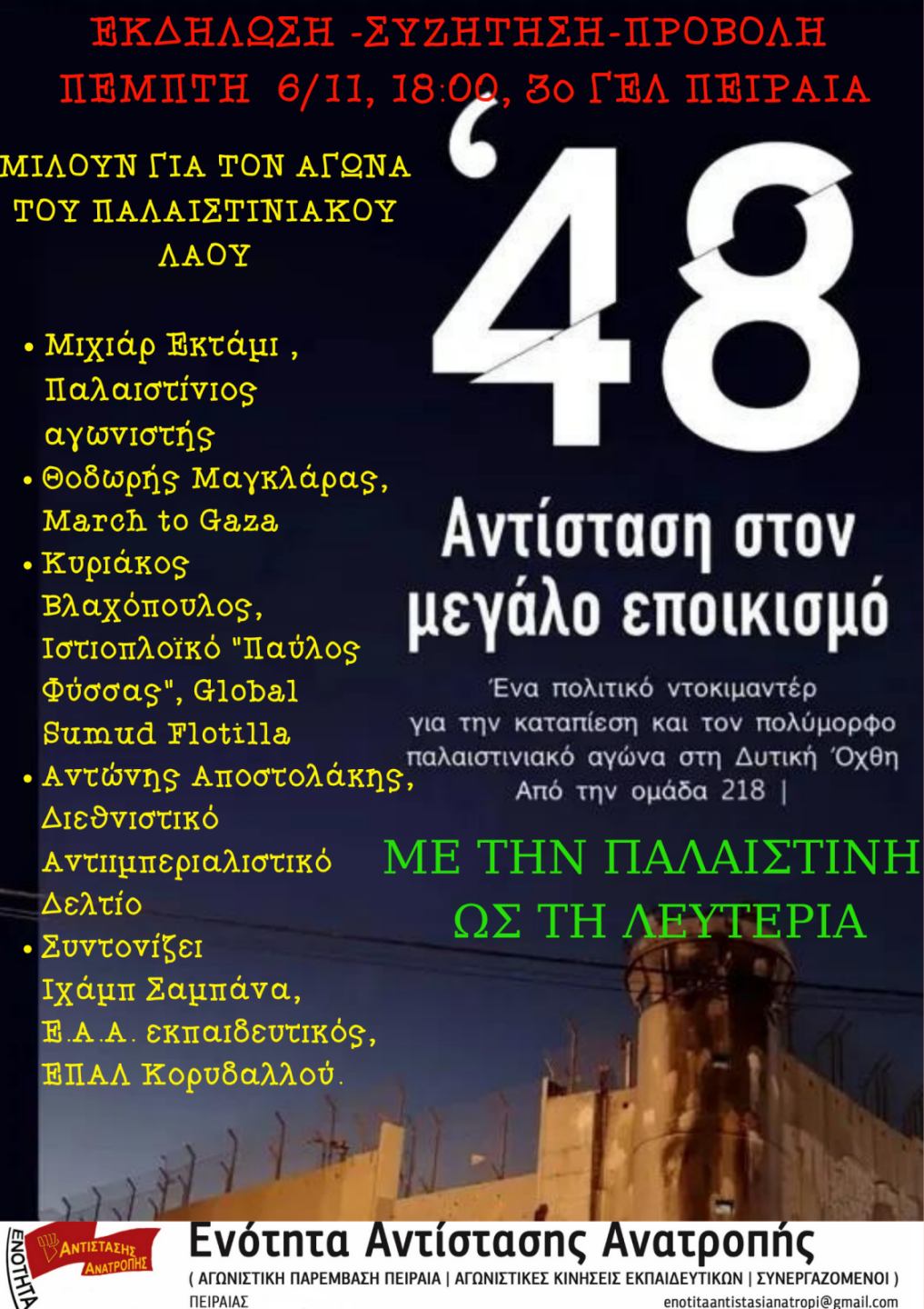 Προβολή ντοκιμαντέρ και συζήτηση για την Παλαιστίνη, 6/11, 6 μμ, 3ο ΓΕΛ Πειραιά