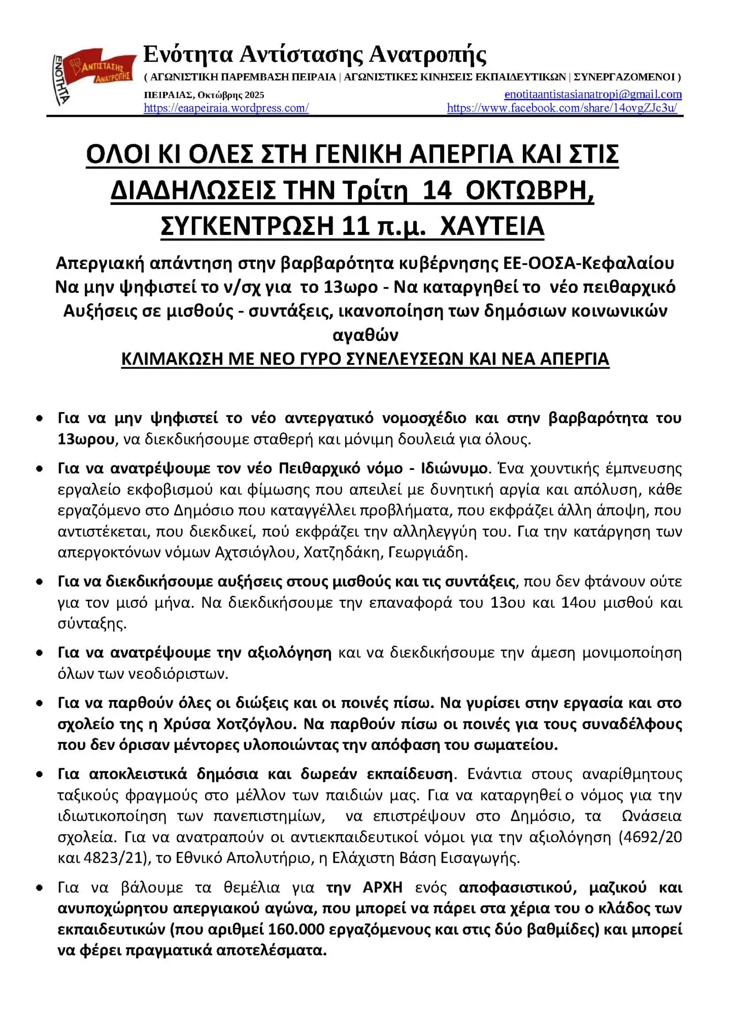 Προτάσεις της ΕΑΑ: Τα βήματα οργάνωσης και αγώνα που πρότεινε η ΕΑΑ στο ΔΣ της ΕΛΜΕ Πειραιά και...