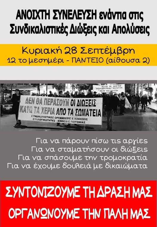 Την Κυριακή 28/9/25 πραγματοποιήθηκε η 10η Ανοιχτή Συνέλευση Ενάντια στις Συνδικαλιστικές Διώξεις και Απολύσεις, με την παρουσία αρκετών αγωνιστών από πρωτοβάθμια σωματεία, συλλογικότητες, μελών πολιτικών οργανώσεων αλλά και ανένταχτων αγωνιστών. Η συζήτηση ήταν πλούσια με αρκετές τοποθετήσεις να θέτουν προβληματισμούς και ζητήματα όπως το νέο πειθαρχικό, οι διώξεις, η αξιολόγηση, το 13ωρο, τα εργατικά ατυχήματα – εργοδοτικά εγκλήματα, η φτωχοποίηση, ο πόλεμος. Κοινός τόπος όλων των παρεμβάσεων, η ανάγκη να αναδειχθούν τα βασικά επίδικα και η επιδίωξη αγωνιστικών απαντήσεων και κινηματικών γεγονότων. Σε αυτό το πλαίσιο λήφθηκαν οι εξής αποφάσεις: