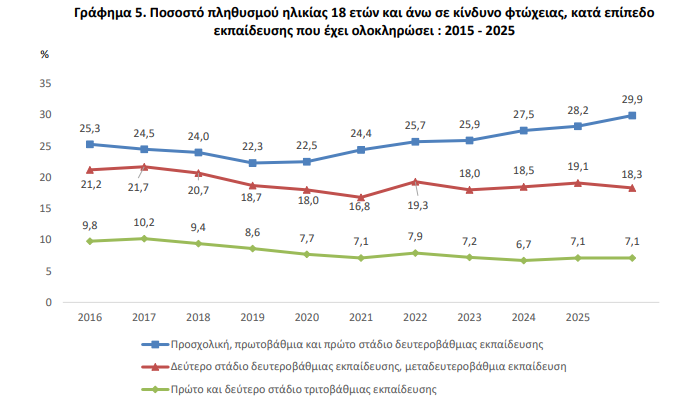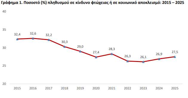 ΕΛΣΤΑΤ: Το 27,5% του πληθυσμού στην Ελλάδα βρίσκεται σε κίνδυνο φτώχειας ή κοινωνικού αποκλεισμού